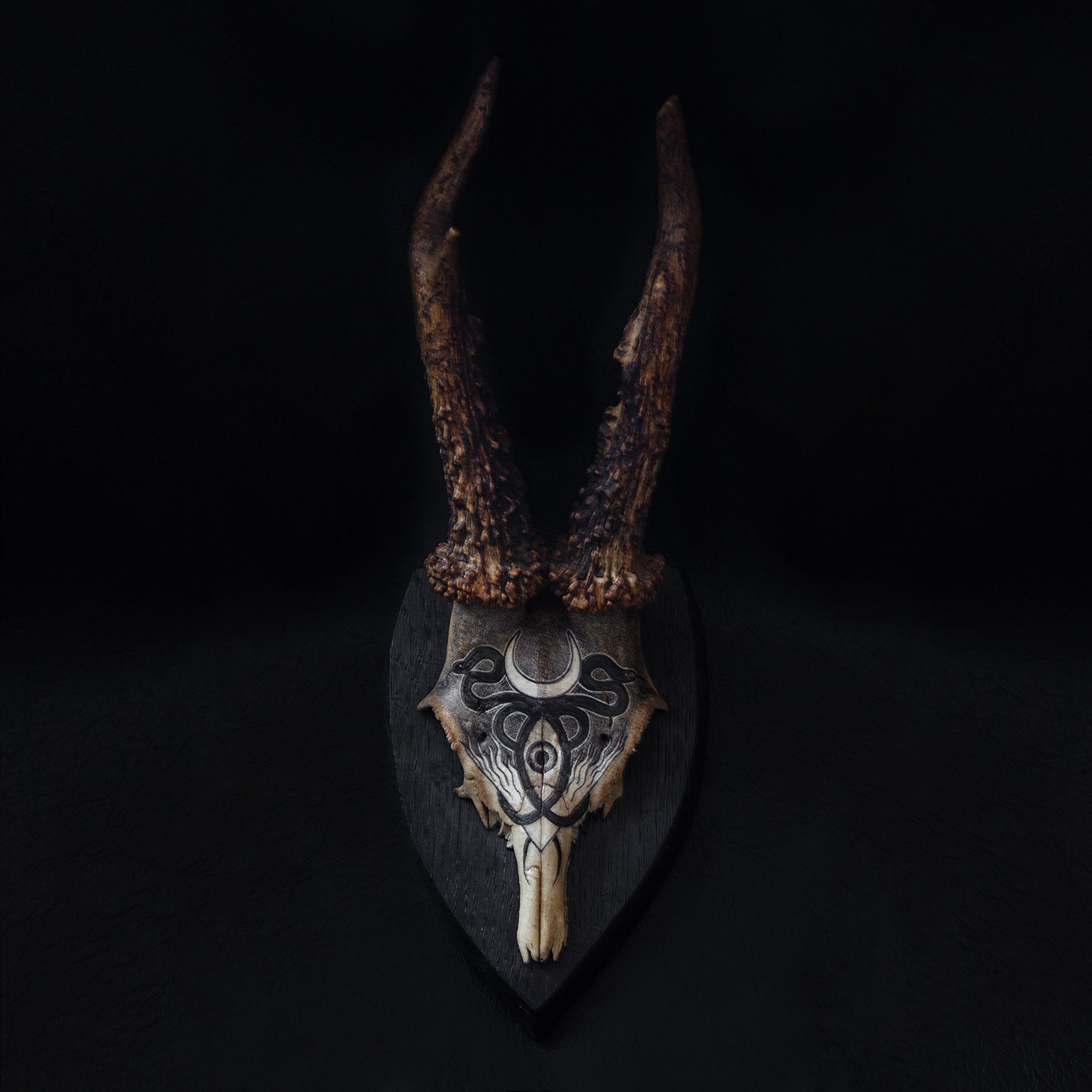 unique hand painted deer skull. very detailed - painted with black ink with delicate engravings. natural colored horns. black painted wooden back. this skull is over 85 years old.